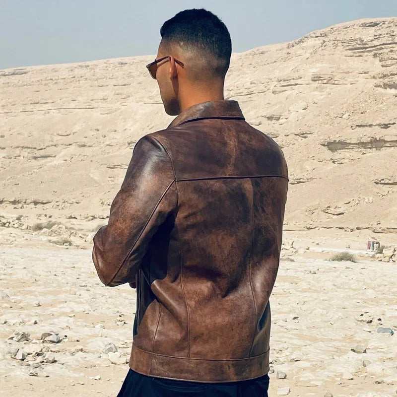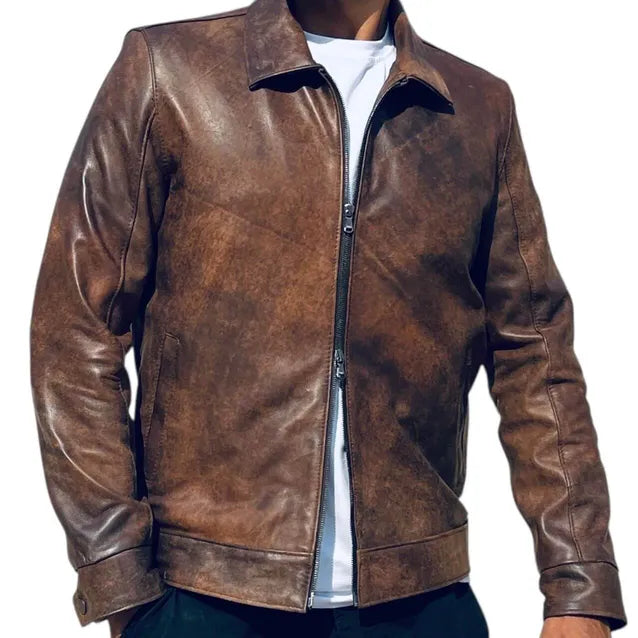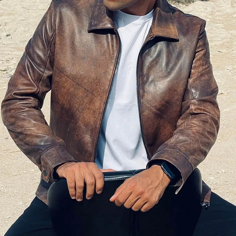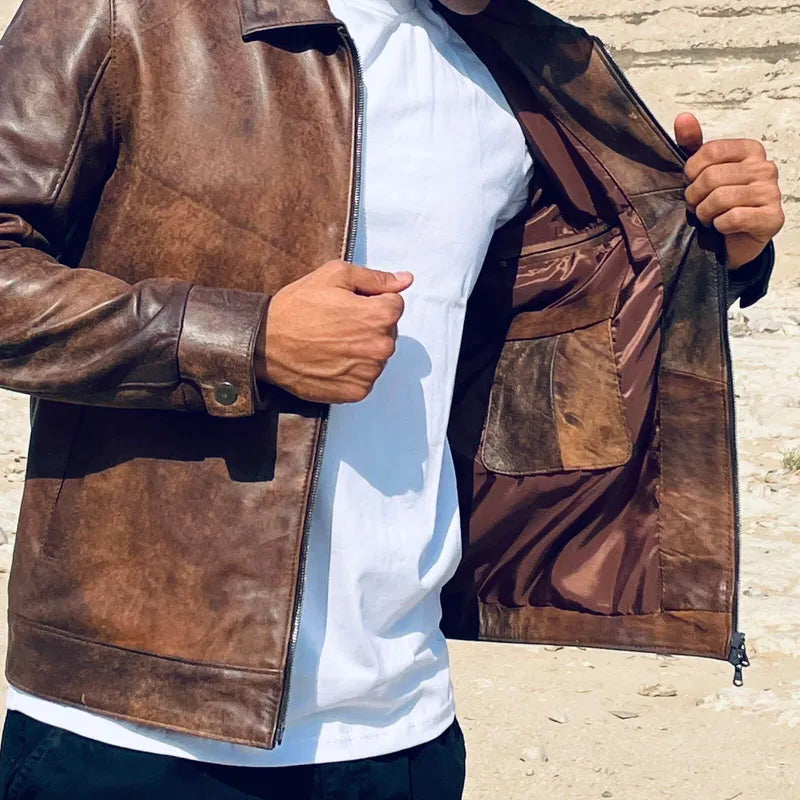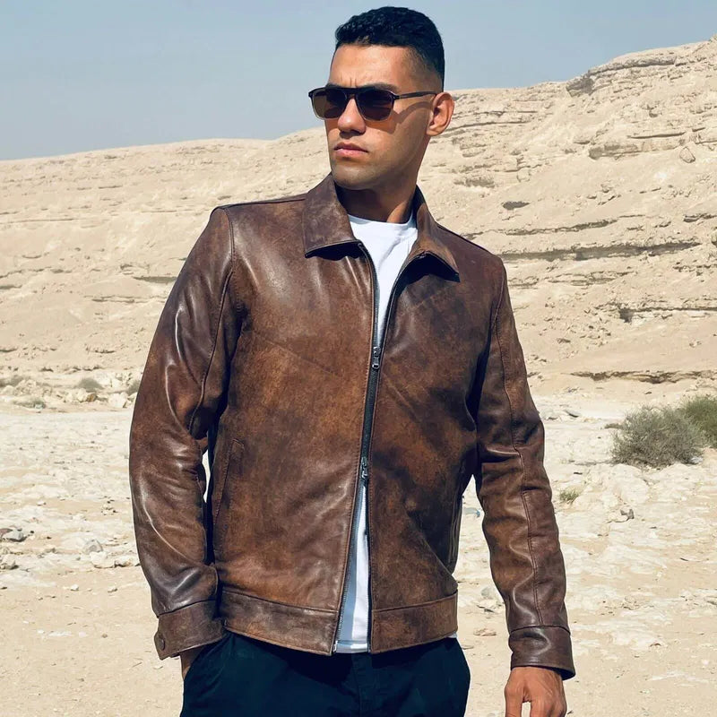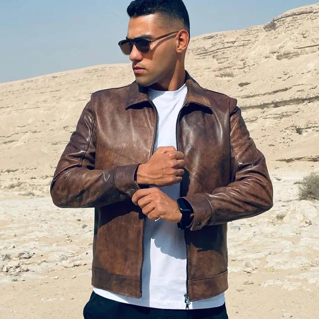 A refined handmade minimalist jacket crafted from premium genuine lamb leather, offering a smooth, elegant finish suitable for smart and everyday wear. Designed with a waterproof inner lining, ultra-durable zippers, and functional interior pockets for maximum comfort.