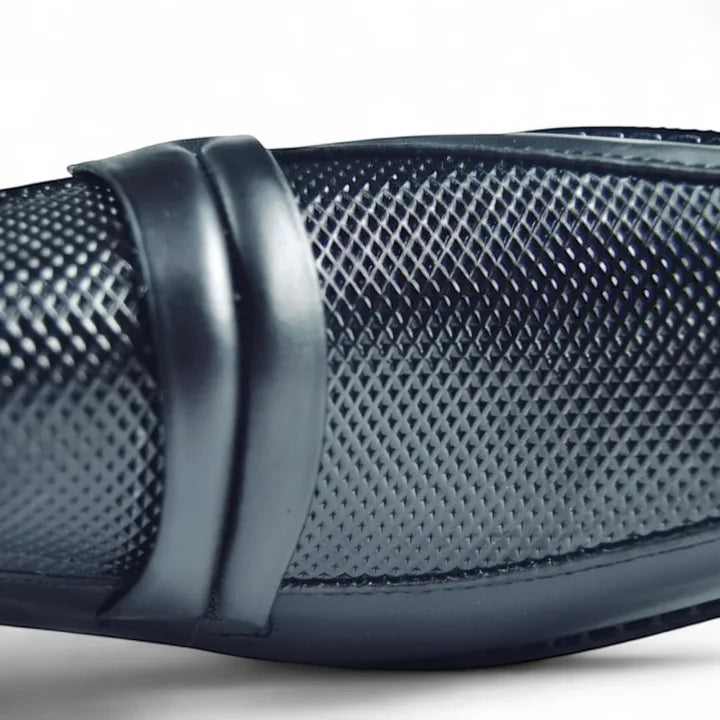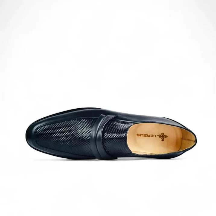 Handcrafted slip-on loafer in a classic two-tone design, combining embossed glossy leather at the front with smooth matte leather for a refined contrast and everyday comfort.