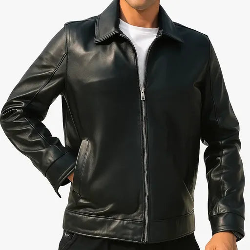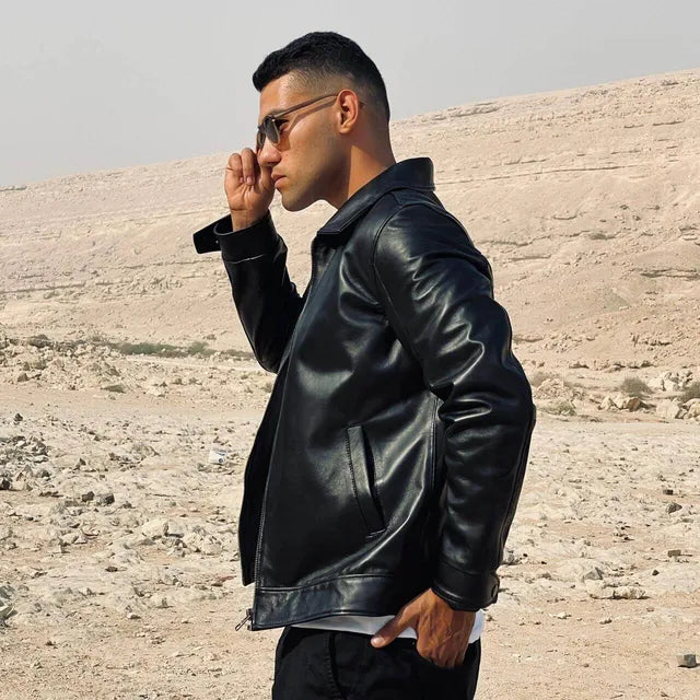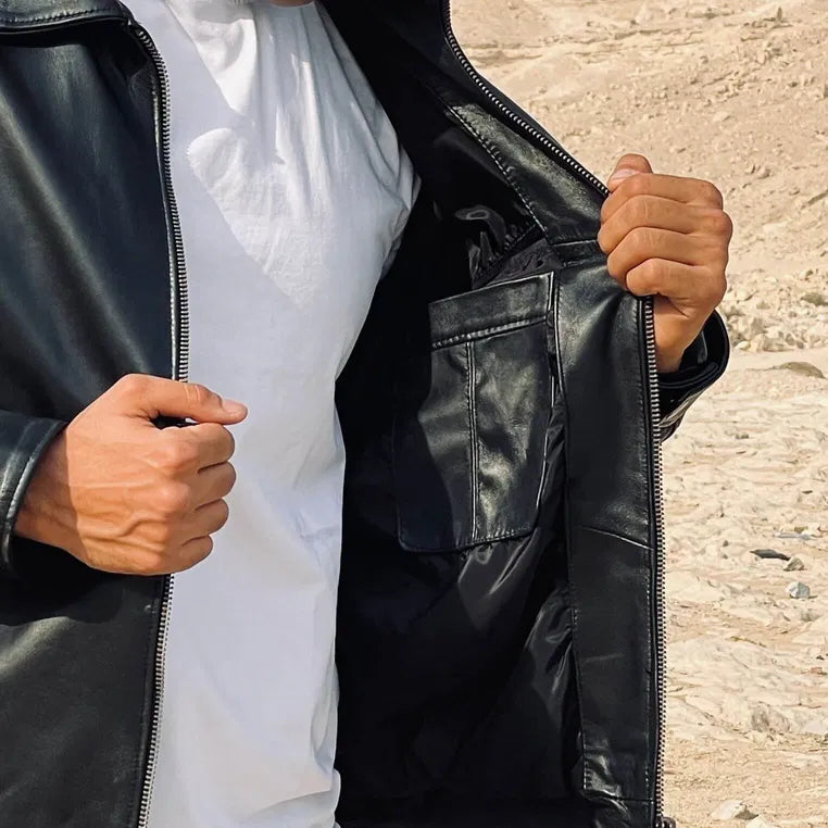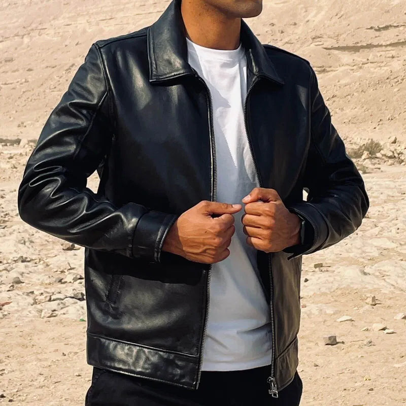 A refined handmade minimalist jacket crafted from premium genuine lamb leather, offering a smooth, elegant finish suitable for smart and everyday wear. Designed with a waterproof inner lining, ultra-durable zippers, and functional interior pockets for maximum comfort.